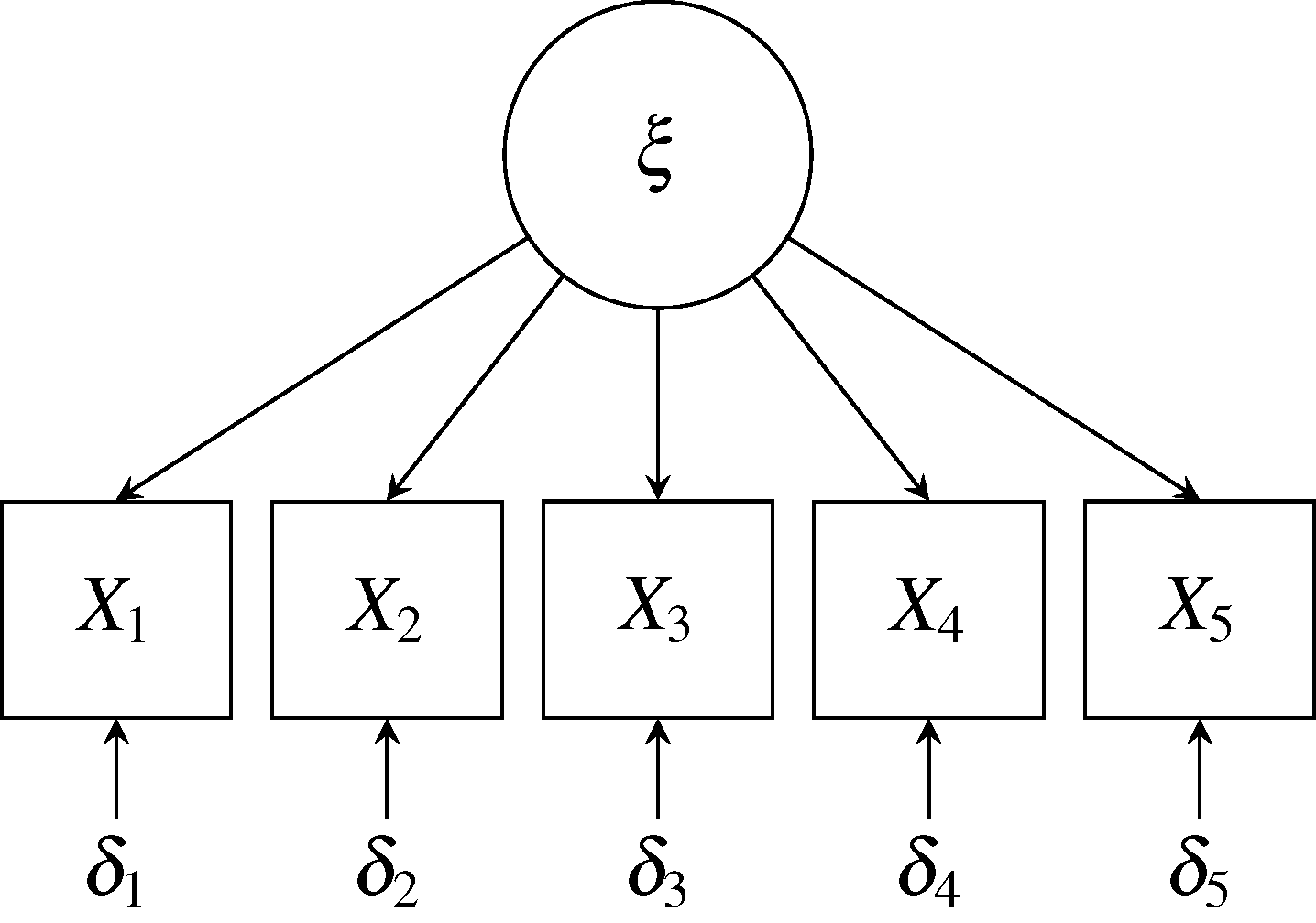 图中指向每个考试变量的箭头(即观测计量值,用盒形表示)指示测量中变异的贡献源。 这种情况下,每个测量值 $X_i$有两个变异的贡献源(都不可观测):公因子 $\xi$和一个特殊因子 $\delta_i$。 用公式的形式,可以写作下式 $$\begin{aligned} X_1 & = \lambda_1\xi + \delta_1 \\ X_2 & = \lambda_2\xi + \delta_2 \\ X_3 & = \lambda_3\xi + \delta_3 \\ X_4 & = \lambda_4\xi + \delta_4 \\ X_5 & = \lambda_5\xi + \delta_5 \\ \end{aligned}$$ 在这些公式中,系数 $\lambda$ 反映了潜在公因子 $\xi$体现在测量值 $X$中的程度。 假设 $X$和 $\xi$ 都是标准化的变量(即有零均值和单位方差), $X_i$的方差可以被分解为: $$\mathrm{var}{X_i} = \mathrm{var}{\lambda_i\xi + \delta_i} = \lambda_i^2 + \mathrm{var}{\delta_i} = 1$$ 由于变量被标准化,$\lambda_i$可以解释为相关系数。 $\lambda_i^2$ 可被解释为 $X_i$中的变化在公因子 $\xi$反映的比例,被称作 $X_i$的。 $X_i$中剩余的变化可由特殊因子 $\delta_i$解释。 如果用 $\theta_{ii} = \mathrm{var}{\delta_i}$来表示特殊因子的方差(我们假设它反映了 $X_i$的计量误差), 那么 $X_i$的共同度等于 $$1 - \theta_{ii}^2$$