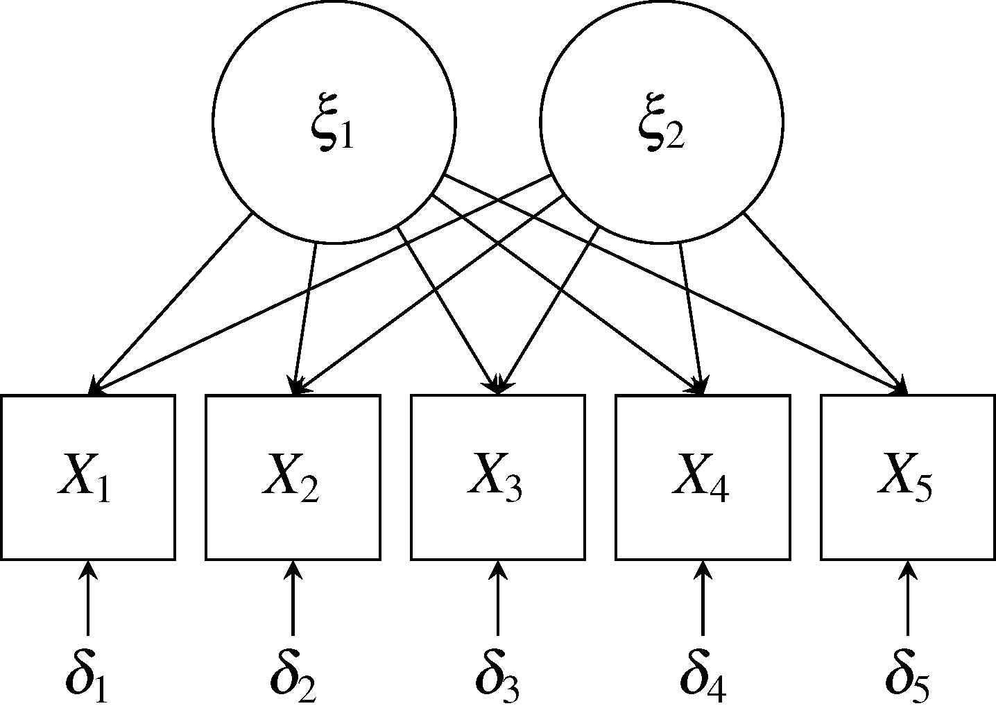 在双因子模型中,在每个考试得分度量 $X_i$中有三个源贡献了变异: 两个公因子 $\xi_1$和 $\xi_2$以及一个特殊变量 $\delta_i$。 使用公式的形式,双因子模型可以写作: $$\begin{aligned} X_1 & = \lambda_{11}\xi_1 + \lambda_{12}\xi_2 + \delta_1 \\ X_2 & = \lambda_{21}\xi_1 + \lambda_{22}\xi_2 + \delta_2 \\ X_3 & = \lambda_{31}\xi_1 + \lambda_{32}\xi_2 + \delta_3 \\ X_4 & = \lambda_{41}\xi_1 + \lambda_{42}\xi_2 + \delta_4 \\ X_5 & = \lambda_{51}\xi_1 + \lambda_{52}\xi_2 + \delta_5 \\ \end{aligned}$$