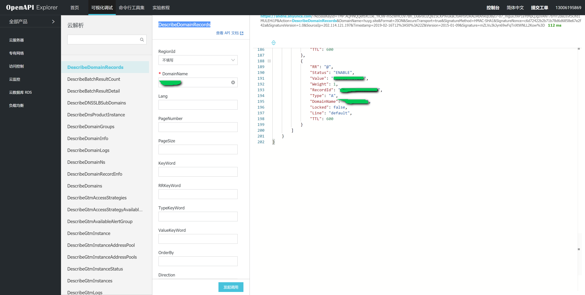 首先在 OpenAPI Explorer 中选择“云解析”的接口,找到 DescribeDomainRecords 接口,填入指定的参数, 点击“发起调用”,即可看到所有的域名解析记录。