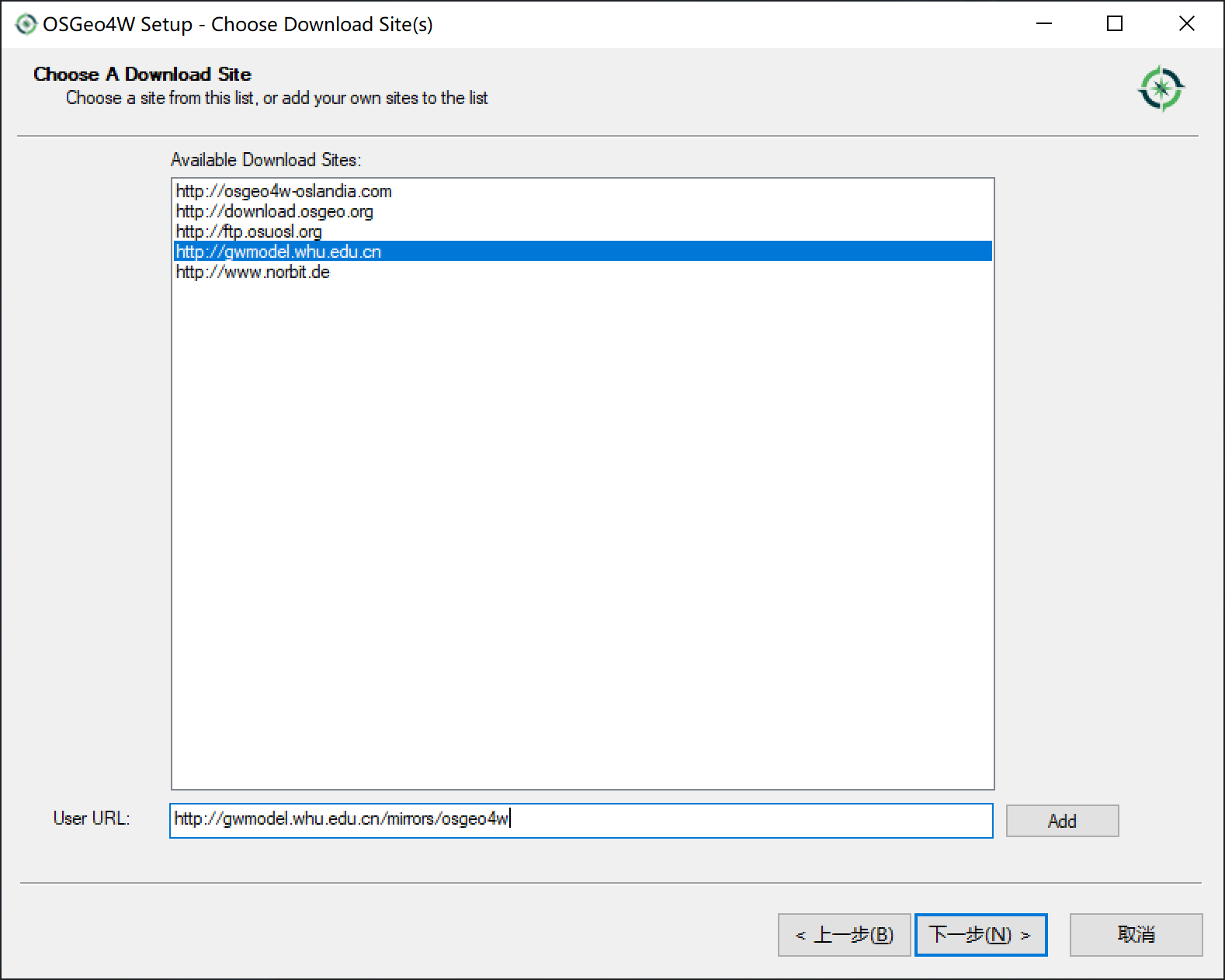 - 然后会下载一些包,进入到下载点选择,可以直接选择 http://download.osgeo.org 那个。如果觉得网速比较慢,可以使用 GWmodel 实验室提供的 OSGeo4W 的镜像,在 User URL 里面输入 http://gwmodel.whu.edu.cn/mirrors/osgeo4w 然后点击 Add 按钮即可添加。