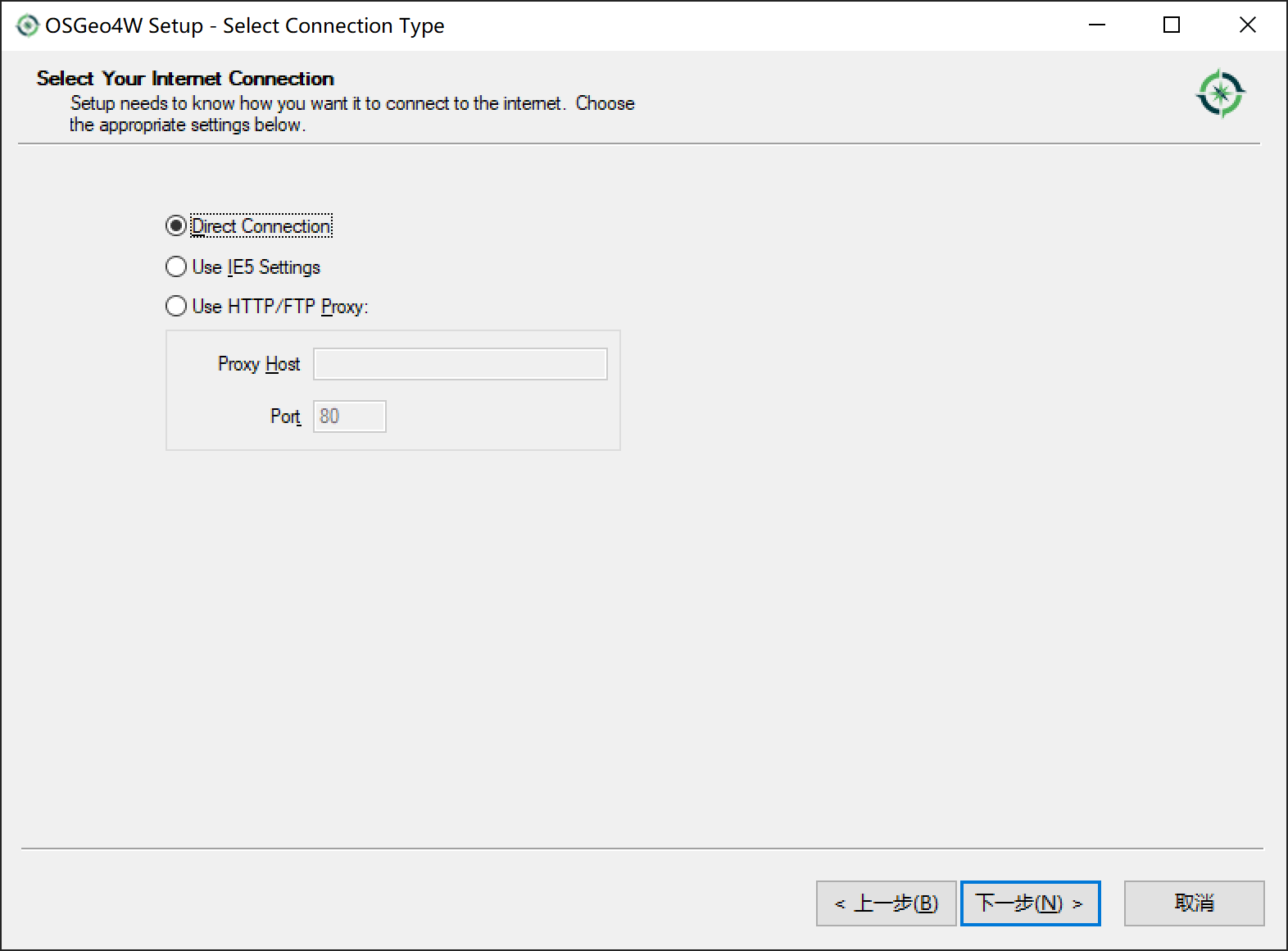 - 网络连接方式,如果没有梯子,就可以选择 Direct Connection ;有的话可以选择 Use IE5 Settings 直接导入系统代理配置,或者选择 Use HTTP/FTP Proxy 自己定义代理