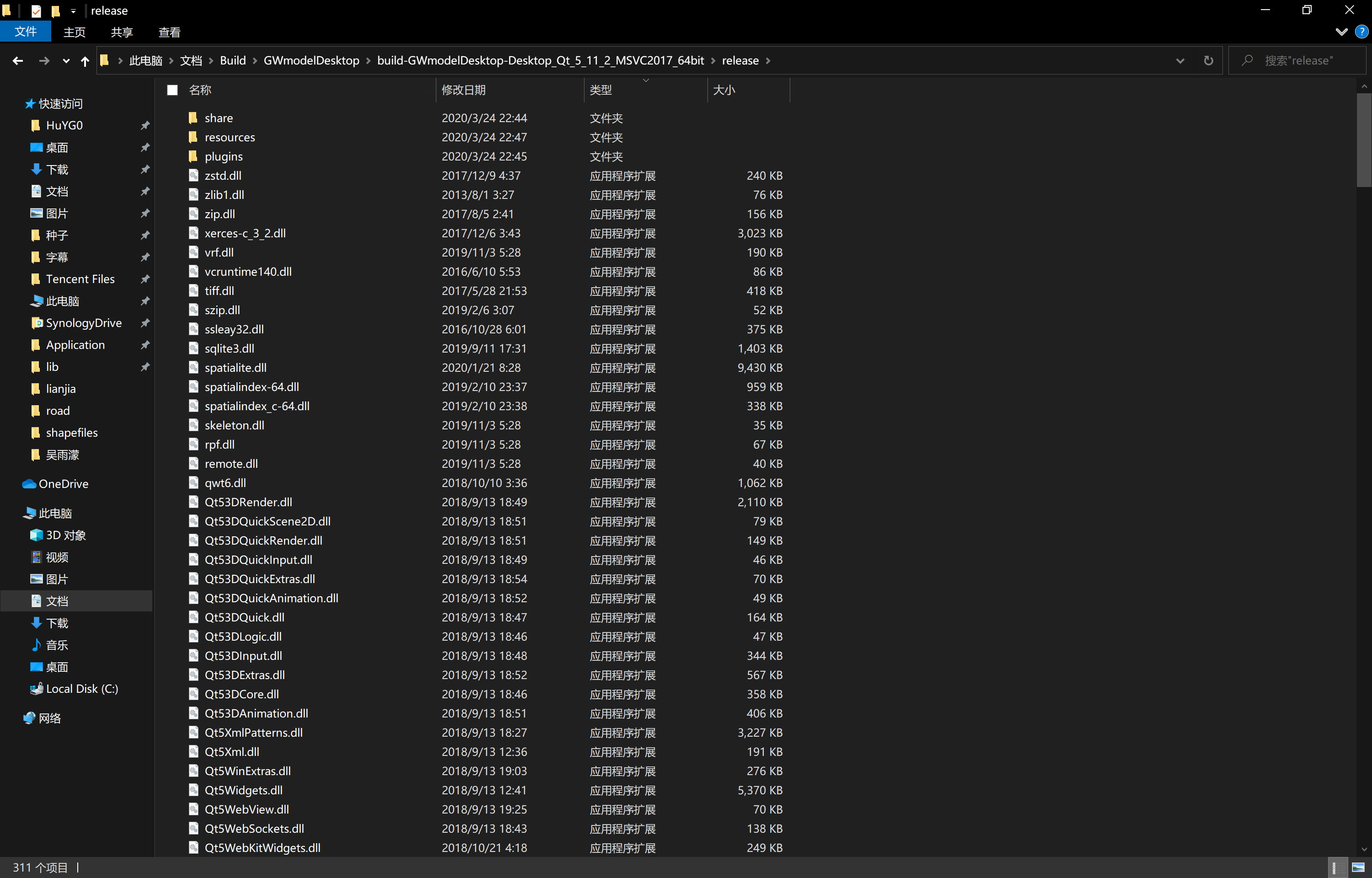 - Qt 相关的 DLL 。可以使用 Qt 提供的 windeploy 工具直接部署。但是由于 QGIS 所引用的 DLL 用这个工具是无法部署过来的,因此还需要将缺少的 C:/Qt/5.11.2/msvc2017_64/bin 中的 DLL 拷贝过来(注意不需要以 d.dll 结尾的动态链接库)。如果嫌 windeploy 麻烦,可以直接将 C:/Qt/5.11.2/msvc2017_64/bin 的 DLL 拷贝过来,然后再把 C:/Qt/5.11.2/msvc2017_64/plugins 文件夹拷贝到工程生成的 exe 同级目录下(示例图中采用的是这种方法)。