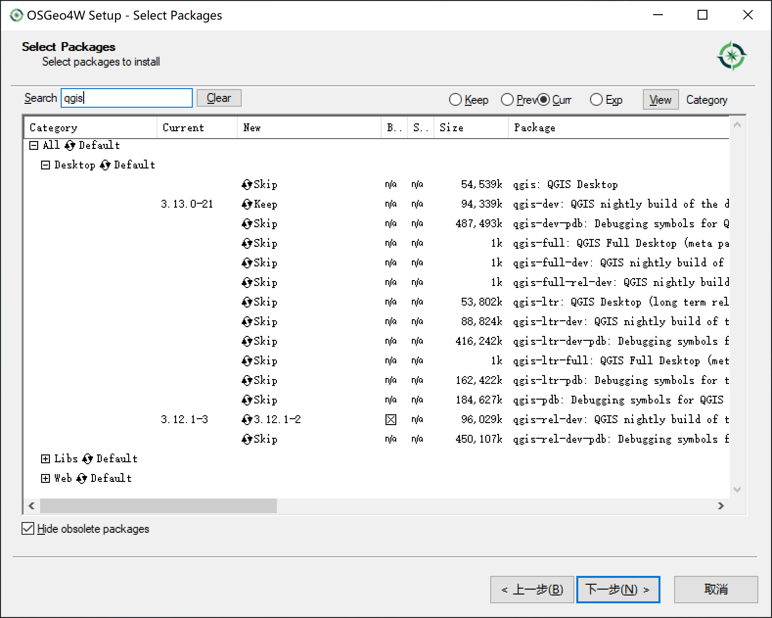 - 安装内容,可以在搜索框里面输入 qgis 进行搜索。可以看到有多种 qgis 版本安装包。综合各种因素考虑,最好是选择 qgis-rel-dev 这个版本的包,这个包是最新的 QGIS Release 版本的源代码(这里我之前安装了 qgis-dev)。点击 Skip 按钮选择版本号。OSGeo4W 会自动下载各种依赖包。
